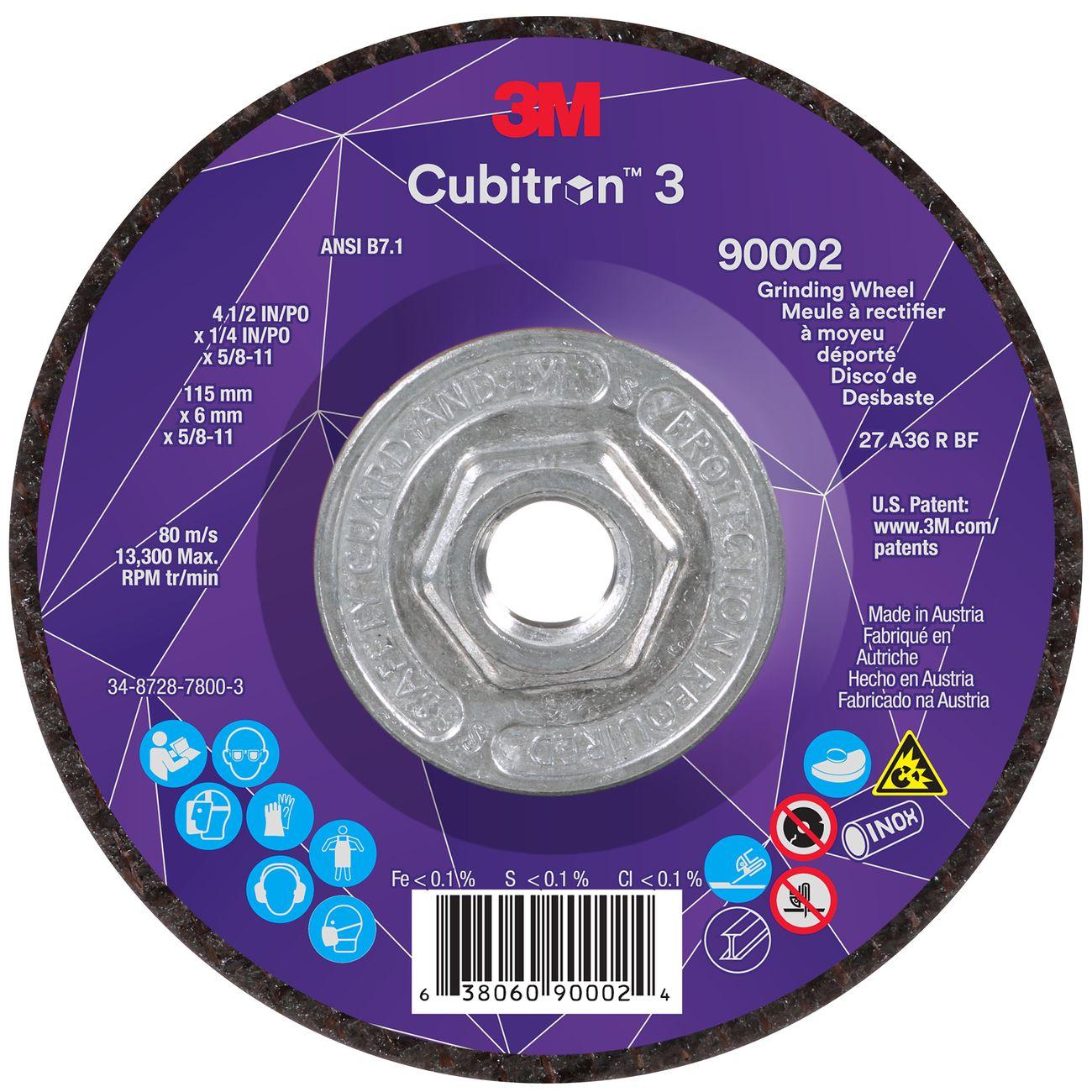 Depressed Center Grinding Wheel, Cubitron? 3, Diameter: 4 1/2 Inch; Thickness: 1/4 Inch; Arbor Hole: 5/8-11; Grit Size: 36+; Type Number: T27; Bond Type: Resin; Color: Black