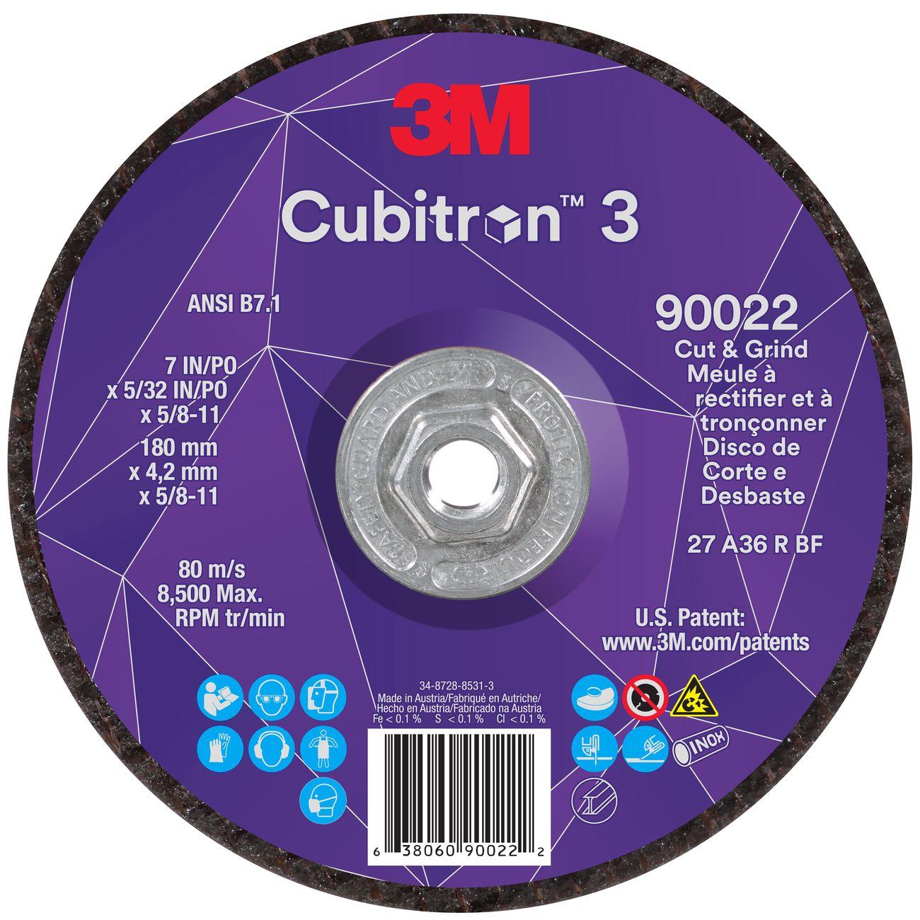 Cut and Grind Wheel, Cubitron? 3, Diameter: 7 Inch; Thickness: 5/32 Inch; Arbor Hole: 5/8-11; Grit Size: 36+; Type Number: T27; Bond Type: Resin; Color: Black