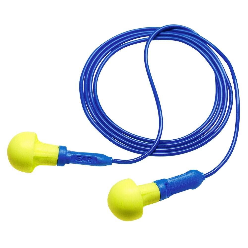Earplugs, E-A-R? Push-Ins Corded Earplugs, Style: Corded; Noise Reduction Rating NRR: 28 dB; Plug Material: Foam/Thermoplastic; Plug Shape: Round; Color: Yellow/Blue; Insertion Style: Push-to-fit; Pack: 100 Pair/Box, 4 Box/Case